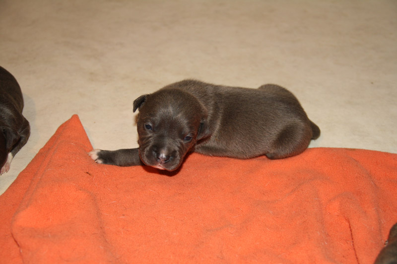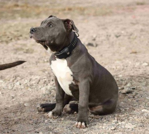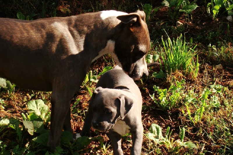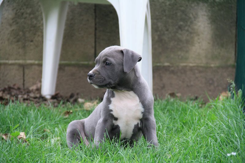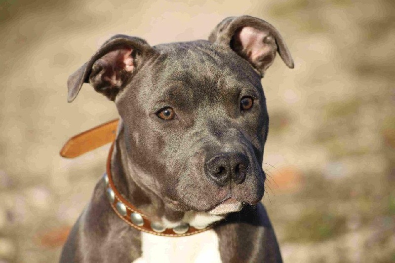 Etalon bleu panaché blanc, de pure race American Staffordshire Terrier .